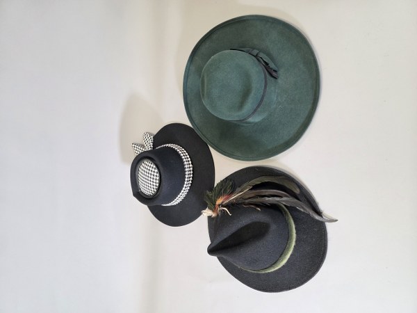 Ensemble de huit chapeaux majoritairement en feutre et velours dans les tons noirs, beiges et verts. Traces d'usage.
