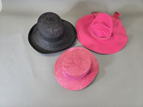 Ensemble de treize chapeaux en feutre, paille tressée de différentes formes dans les tons noirs et roses. Traces d'usage.