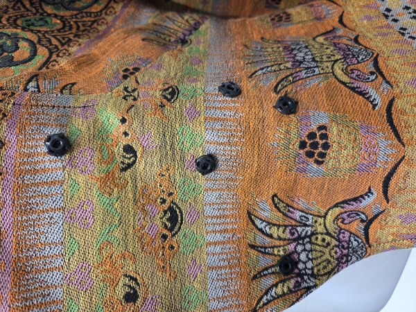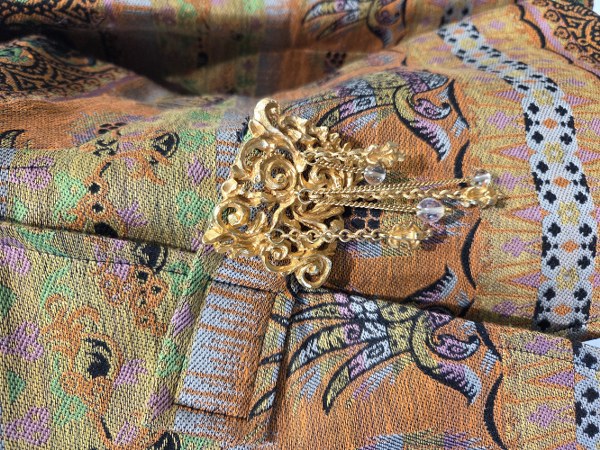 CHRISTIAN LACROIX. Veste multicolore orange, vert, rose, noir en frises, encolure découpée à décroché sur fermeture pate à finition bijou en métal doré gravé, découpé et pampilles, manches longues. Taille 36. Griffe fuchsia. Etiquette partiellement enlevée (matériaux et taille). Traces d'usure.