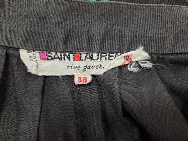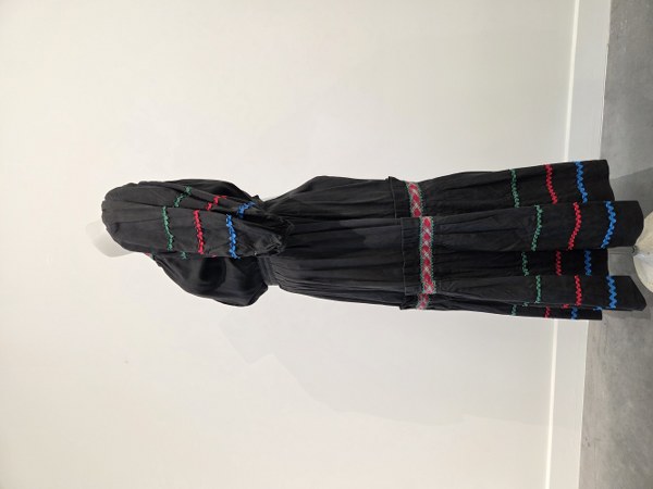 SAINT LAURENT rive gauche. Ensemble gitane en coton noir rebrodé de galons en crochet ou frise rouge, vert, bleu, composé d'un top à encolure carrée boutonnée, manches ¾ et d'une jupe longue plissée. Griffe blanche, graphisme noir rehaussé de deux carrés couleur. Taille indiquée 38. Usure.