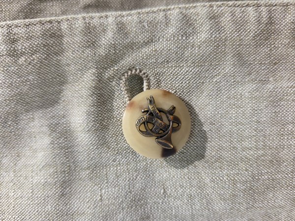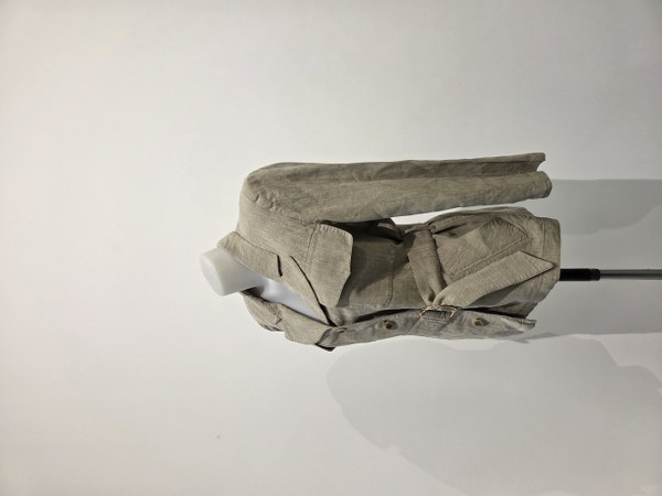 HERMES Paris. Veste en coton et lin chiné beige, d'esprit saharienne, col cranté, simple boutonnage en manches longues, deux importantes poches plaquées sous rabat à la poitrine, ceinture, deux poches en biais. Usure.