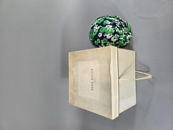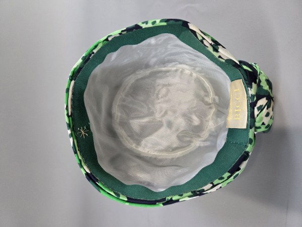 MADEMOISELLE RICCI. Toque en mousseline imprimée floral marine, vert plissé ramassé en chignon au dos. Boite.