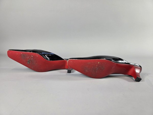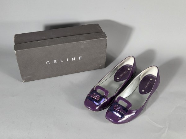 Ensemble d'escarpins et chaussures comprenant: VALENTINO. Paire de mules vernies noires, semelle rouge. Taille 6 1/2. CELINE. Paire de ballerines en verni mauve, boucle métallique. Taille 37. KARL LAGERFELD. Paire de chaussures à talons en peau noires. Taille 6 1/2. Salvatore FERRAGAMO. Paire d'escarpins à petits talons en cuir deux tons bleu et blanc. Taille 7B. SONIA RIKIEL. Paire d'escarpins à petits talons en peau rouge. Taille 37. Traces d'usure.