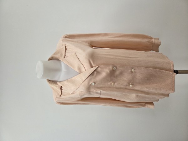 NINA RICCI BOUTIQUE. Chemisier façon veste en soie façonnée saumon à double boutonnage.Taille estimée 38. Traces d'usure.