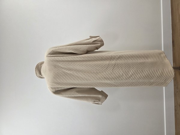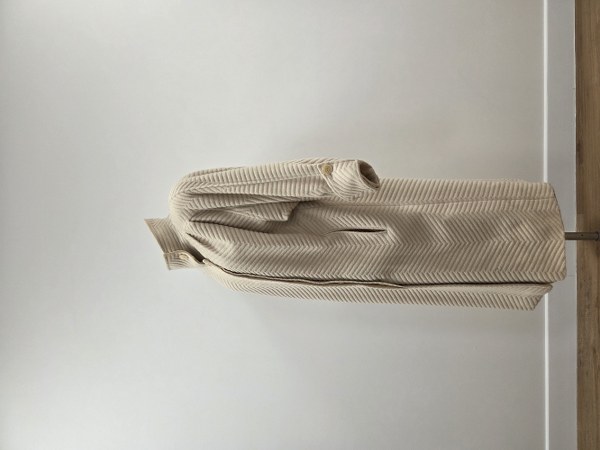 MADEMOISELLE RICCI. Manteau ivoire à effet chevrons, col montant, simple boutonnage sous patte, manches longues raglan, revers aux poignets. Traces d'usure.