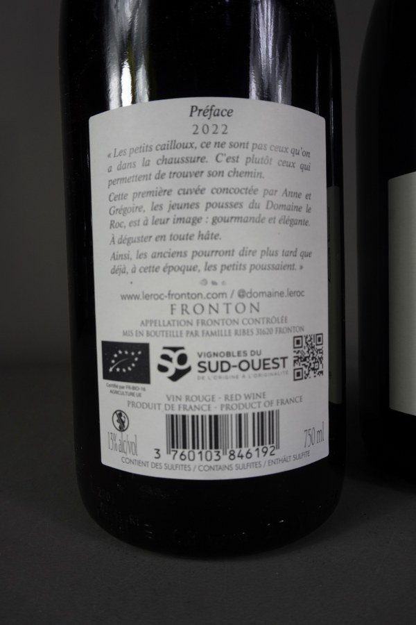 3 bouteilles FRONTON, Domaine le Roc, Les Petits Cailloux du Roc, préface 2022.