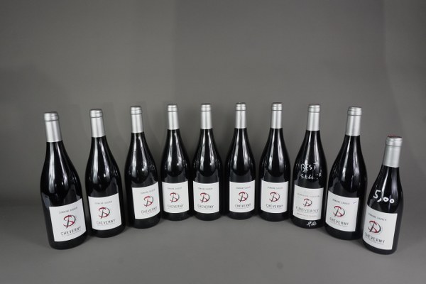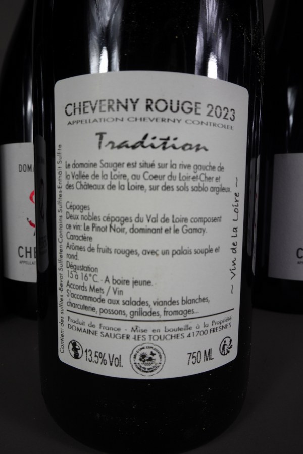 9 bouteilles CHEVERNY Rouge, Domaine Sauger, Tradition, dont 1 de 2021, 1 de 2022, 7 de 2023. On y joint une demi bouteille de 2023.