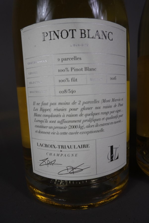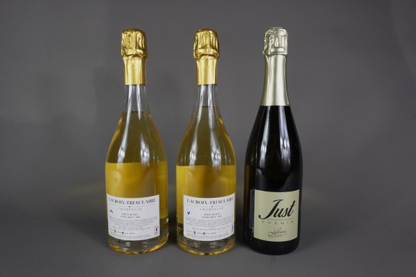 Lot de 3 bouteilles : - 2 CHAMPAGNE, Lacroix-Triaulaire, Pinot blanc Extra brut, 2016 -1 CREMANT DE LOIRE, Domaine des Closserons, Just, brut.