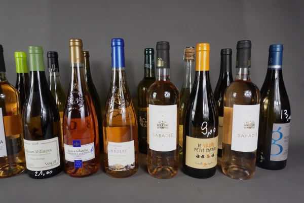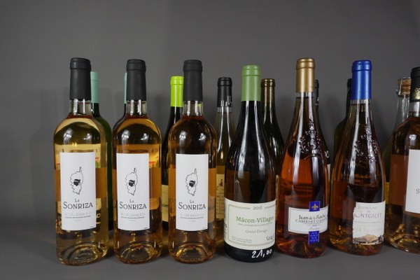 Lot de 18 bouteilles : - 3 ILE DE BEAUTE IGP, La Sonriza, 2022 - 1 CABERNET D'ANJOU, Jean de la Roche, prestige, 2021 - 1 ROSE DE LOIRE, Domaine de Montgillet, 2021 - 1 COTEAUX DE BEZIERS blanc, Hauts comme 3 pommes, 2023 - 2 COTES DE GASCOGNE blanc, Domaine Entras, Entras 2022 - 1 COTES DE GASCOGNE, Domaine Chiroulet, Java les terres joyeuses, 2022 - 1 VDF, Aydie, Le Vilain petit canard. - 1 TOURAINE, Complices de Loire, Cuvée Pointe d'Agrumes, 2024 - 1 MACON VILLAGES, Verget, Grand élevage, 2016 - 1 SAVOIE, Domaine Saint-Germain, Crac Boum'Bu, 2022 - 2 VDF Maison Sabadie, réserve rosé 2024 - 1 COTES DE GASCOGNE, Domaine Tariquet, Classic, 2023 - 1 VDF Arnaud Combier, Goutte Blanche, 2022 - 1 BOURGOGNE famille Gueguen, Bourgogne Côtes Salines, 2020 On y joint une bouteille de vin désalcoolisée UBY boisson effervescente