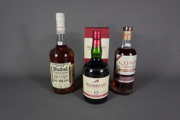 Lot de 3 bouteilles comprenant : - WHISKY George Dickel, N°12. - IRISH WKISKY Redbreast Single Pot, aged 12 - CALIFORNIA WHISKEYS Sonoma Distilling, Cherrywood Smoked Bourbon