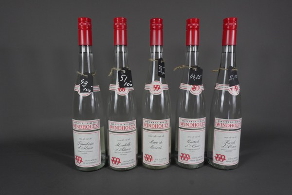 Lot de 5 bouteilles EAU DE VIE Distillerie Windholtz dont : 1 Kirsh d'Alsace, 1 Questsch d'Alsace, 1 Marc de Muscat, 1 Framboise d'Alsace, et 1 Mirabelle d'Alsace.