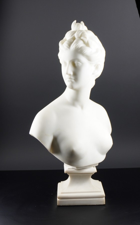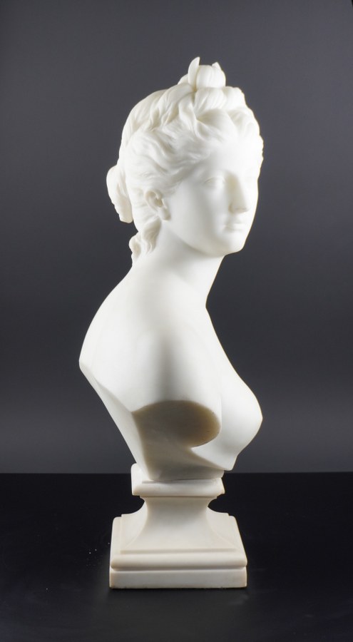 Diane chasseresse. Sculpture en marbre blanc. Porte une signature 'J.Blanchard'. Hauteur : 61 cm. Éclat sur le piédouche.
