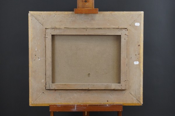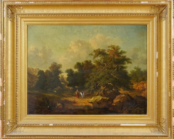 Théophile Victor Émile LEMMENS (1821-1867). Lingère marchant, dans un paysage arboré et rocailleux. Huile sur toile signée en bas à droite. 41 x 54,5 cm. Déchirure, salissures.