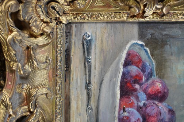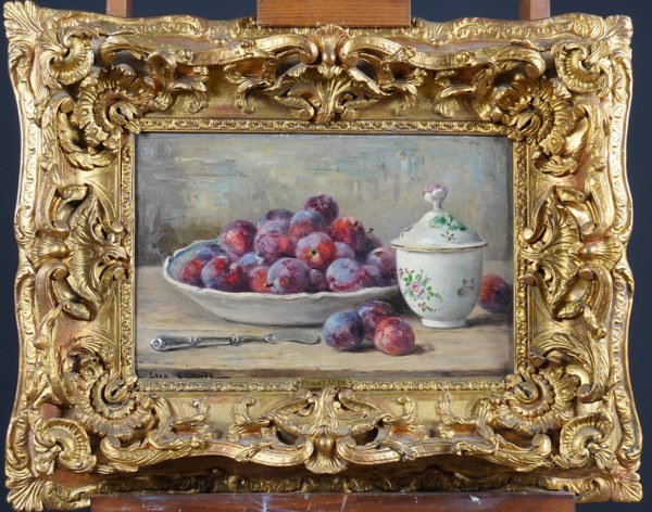 Eugène CLAUDE (1841-1922). Nature morte aux prunes. Huile sur toile signée en bas à gauche. 27 x 39 cm.