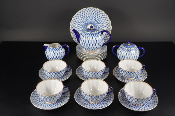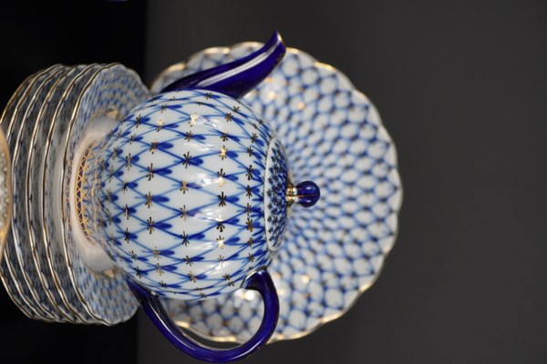 Manufacture impériale de Saint-Petersbourg, Russie. Service à thé modèle Cobalt comprenant théière, pot à lait, sucrier, six tasses et sous-tasses, six assiettes à dessert et un plat. Marque de la manufacture sous la base accompagnée de la mention "fait en URSS". Epoque XXème siècle. Très légère usure à la dorure, quelques micro-égrenures.