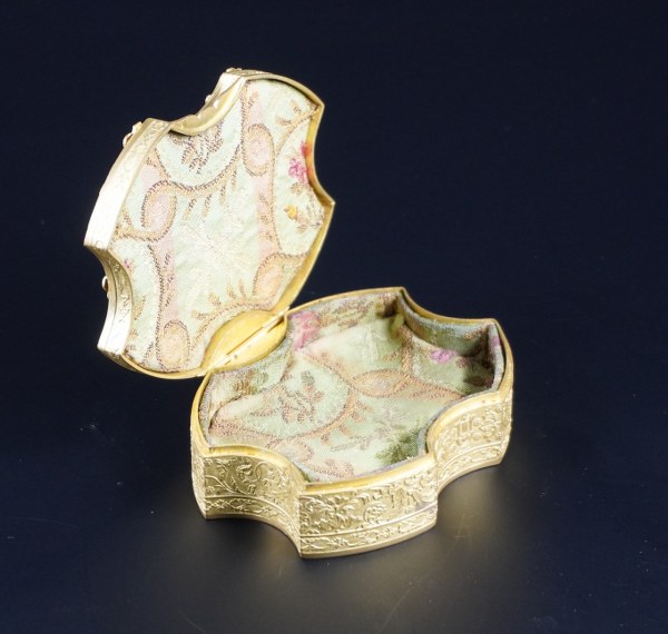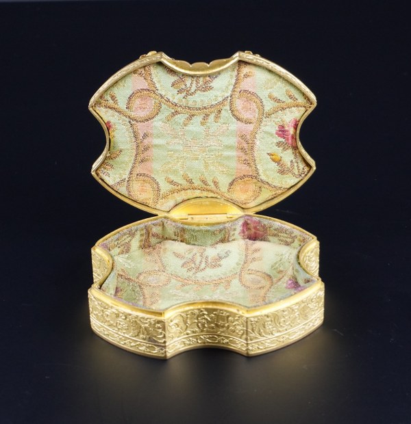 Boite en bronze doré de forme chantournée décoré sur le chant et de guirlandes dessus. Hauteur : 3,5 cm. Largeur : 11,5 cm. Profondeur : 8,5 cm. Manque la miniature au centre.