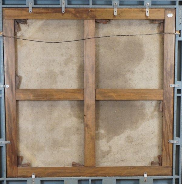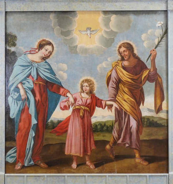 École française du XVIIème siècle. Sainte Famille en chemin. Toile. Hauteur : 105 cm. Largeur : 105 cm. Sans cadre. Restaurations anciennes.