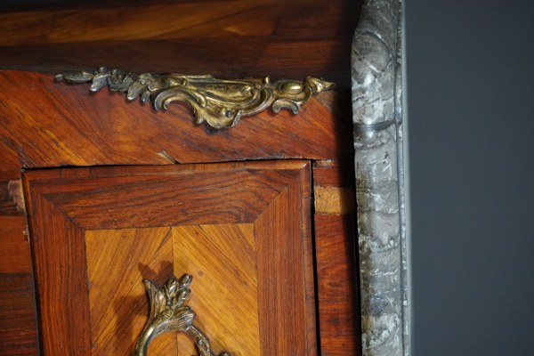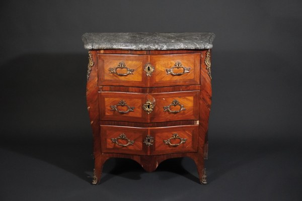 Petite commode galbée sur trois faces en placage de bois de rose et palissandre ouvrant par trois tiroirs. Garniture de bronzes dorés. Dessus de marbre gris Sainte Anne à bec de corbin. Époque Louis XV. Hauteur : 84 cm. Largeur : 81 cm. Profondeur : 43 cm. Petits accidents.