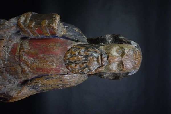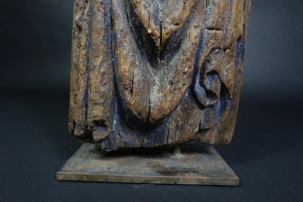Saint Personnage en bois sculpté et polychromé. Tenant un livre fermé de la main droite, il est vêtu d'une tunique, blousante à la taille, et d'un manteau dont un pan revient sur le devant. Lac de Constance ?, vers 1400. Hauteur : 67 cm. Soclé. Érosion et quelques manques.