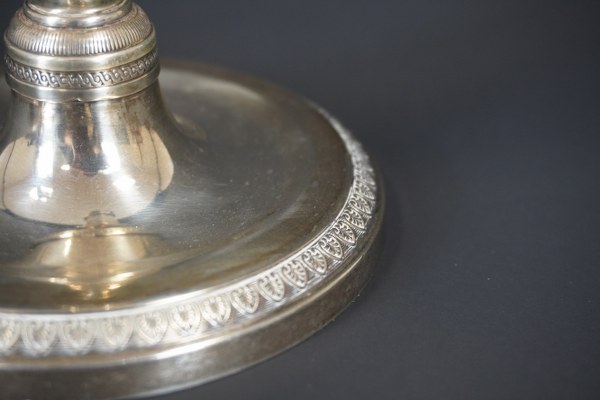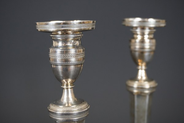 Paire de bougeoirs en argent, la base circulaire à décor d'une frise de palmettes, le fût de section hexagonale, surmonté de binet en forme de vase balustre. Poinçon : Paris, Premier Coq (1798-1808). Maître orfèvre : Pierre PARAUD. Poids : 968 gr. Hauteur : environ 26,3 cm.