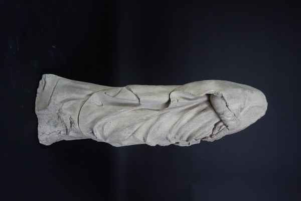 Saint acéphale en pierre calcaire sculptée, dos ébauché. Debout, vêtu d'un manteau dont un pan revient sur le devant en formant des plis étagés, il tient un livre fermé de sa main gauche. Vers 1400. Hauteur : 65 cm. Érosion et manques visibles.