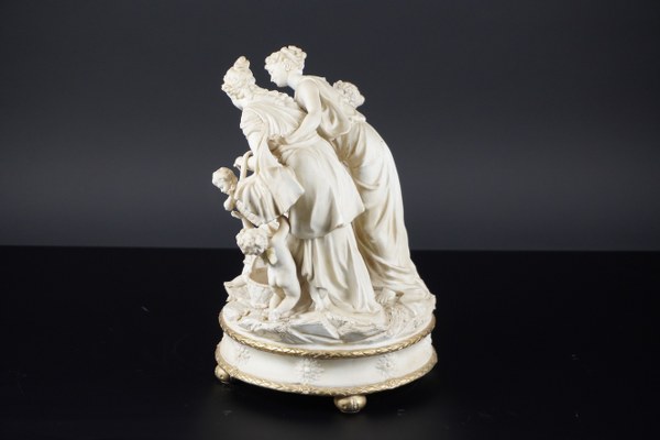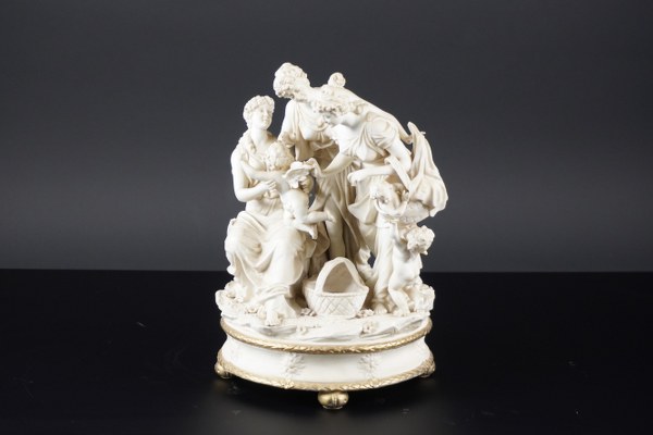 Groupe en biscuit de forme ronde composé de trois femmes jouant avec des amours. Époque fin XIXème siècle. Hauteur : 27 cm. Diamètre : 18,5 cm. Accidents et manques.