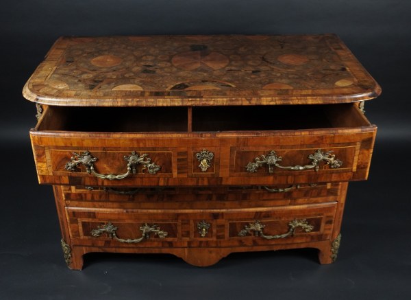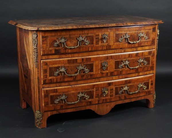 Commode légèrement bombée en façade ouvrant par trois tiroirs en placage d'olivier, palissandre et if. Le dessus à bord mouluré est marqueté de rosaces et d'entrelacs sur un fond d'olivier en bois de bout. Les côtés à losange dans des encadrements. Garniture de bronzes. Époque début XVIIIème siècle. 76,5 x 118,5 x 63 cm. Réparations, manques, fentes.