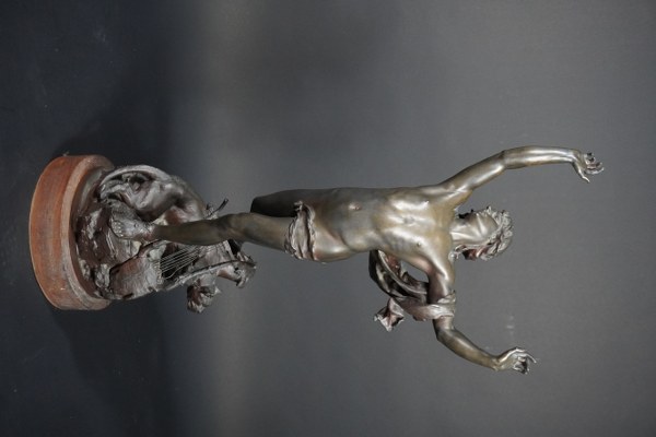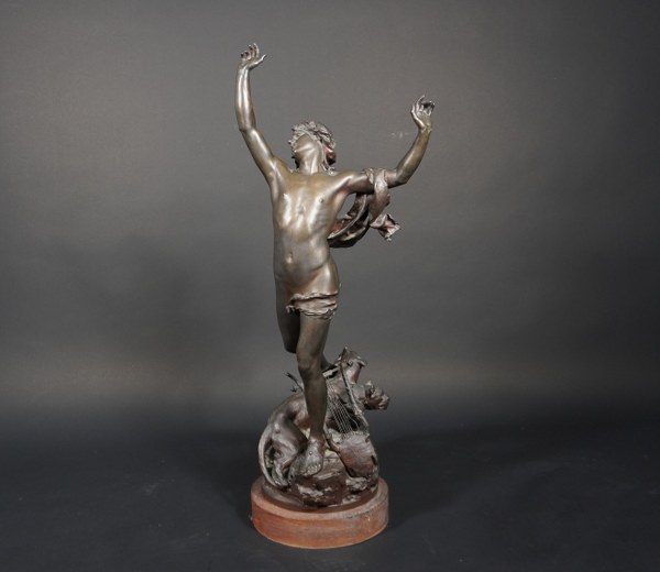 Raoul VERLET (1857-1923). La Douleur d'Orphée, ou Orphée et Cerbère. Epreuve en bronze. Fondeur Barbedienne Usures à la patine, accident à la lyre. Hauteur : 83 cm environ. On y joint un socle en bois (détaché).