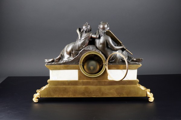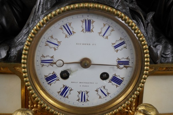 Pendule en bronze patiné, marbre blanc et bronze doré représentant deux divinités. Le cadran signé Richmond, boulevard Montmartre à Paris. Époque XIXème siècle. Hauteur : 32 cm. Longueur : 49 cm. Petit accident à l'émail au carré de remontage. Manque le verre de la lunette arrière, balancier, clef. Petit fêle au marbre à l'arrière.