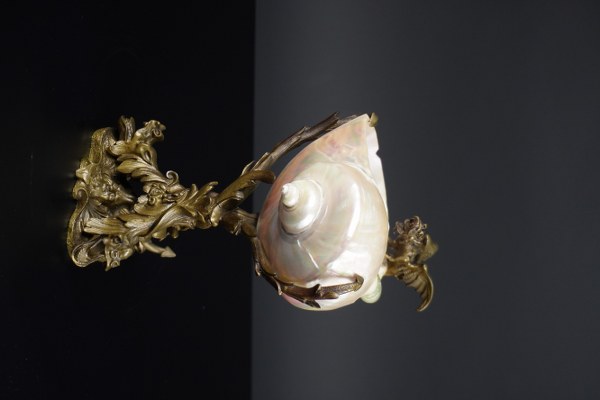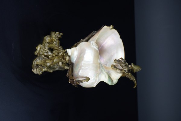 Coquillage turbo imperialis nacré monté sur un socle tripode en bronze à décor de monstres marins et au sommet d'un dragon. Époque Napoléon III. Hauteur : 23 cm. Largeur : 16 cm. Éclat au bord du coquillage, accident à une branche.