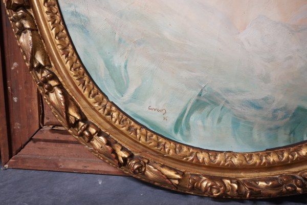 École de la fin du XIXème siècle. Portrait de femme de qualité. Huile sur toile à vue ovale signée et datée 1896. Environ 93 x 74 cm.