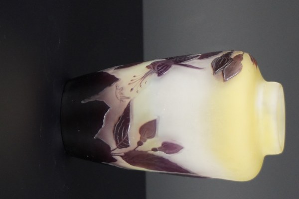 Établissements GALLÉ (1904-1936). Vase en verre multicouche à décor de feuillage violine dégagé à l'acide sur fond jaune nuancé. Signé Gallé. Hauteur : 19,5 cm.