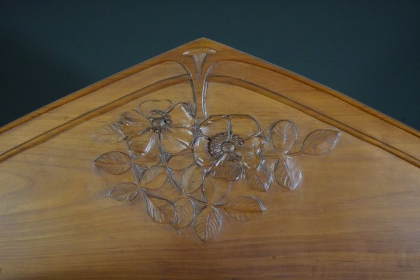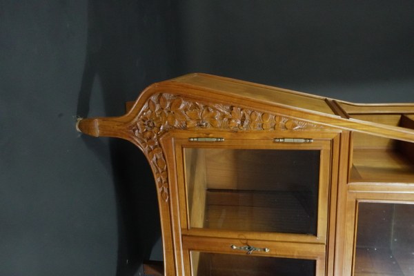 Vitrine de présentation de forme trapézoïde en merisier massif mouluré et sculpté de fleurs présentant en partie haute une niche ouverte à deux tablettes latérales. Dessous au centre, une porte vitrée à deux étagères et de chaque cotés des tablettes. A la base, deux portes vitrées encadrées par des montants évasés à resserves sculptées de fleurs. Époque 1900. Hauteur : 181 cm. Largeur : 89 cm. Profondeur : 33 cm. Accidents, manques.