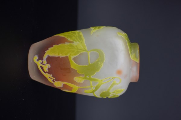 Établissements GALLÉ (1904-1936). Vase en verre multicouche à décor de feuilles d'érable dans les tons jaune-vert sur fond blanc nuancé orange. Signé Gallé en réserve. Hauteur : 12 cm.
