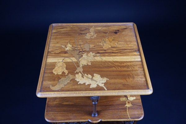 Émile GALLÉ (1846-1904). Casier à musique à quatre compartiments séparés par des panneaux pleins et des panneaux extérieurs en bois découpé. Le plateau intermédiaire plaqué de noyer est décoré d'une fleur marquetée sur un bord. Le plateau supérieur, posé sur quatre colonnettes à bulbe est marqueté de fleurs de différents bois sur un fond de placage de deux bois. L'ensemble repose sur quatre pieds nervurés et courbés vers l'extérieur. Signé E Gallé dans une feuille. Époque 1900. Hauteur : 86,5 cm. Largeur : 45 cm. Profondeur : 45 cm. Deux éléments accidentés. Figure dans l'ouvrage "l'argus des meubles et des objets 1900 édition Belfond", page 47. Nous retrouvons ce même modèle page 51 dans l'ouvrage "meubles et ensembles 1900" par Edith Mannoni aux éditions Charles Massin.