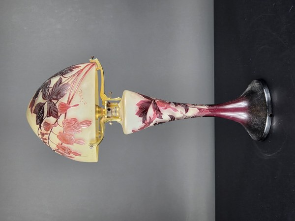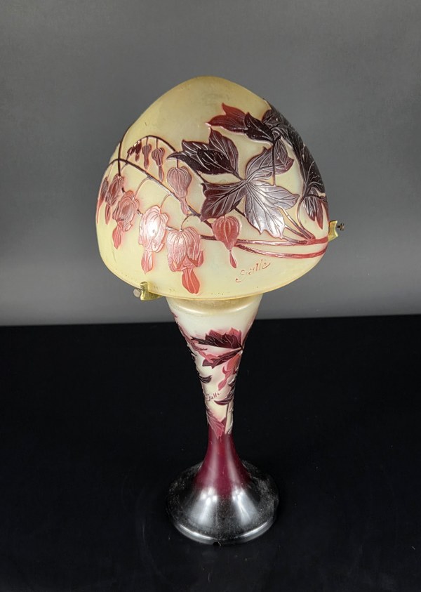 Établissements GALLÉ (1904 - 1936). Lampe champignon. En verre multicouche gravé à l'acide à décor de feuillage dans les tons prune sur fond blanc. Signé en réserve. Hauteur : environ 29 cm. Col accidenté et monture manquante.