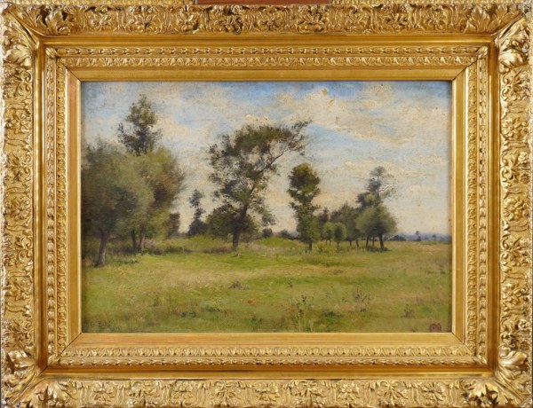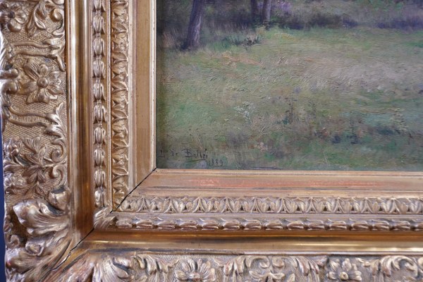 Léon LE GOAEBE DE BELLÉE (1846-1891). Paysage arboré, 89. Huile sur panneau signée en bas à gauche et datée 1889. Cadre marqué au dos au pochoir PARIS 10 rue de la Grange Batelière. 32 x 46 cm. Salissures.