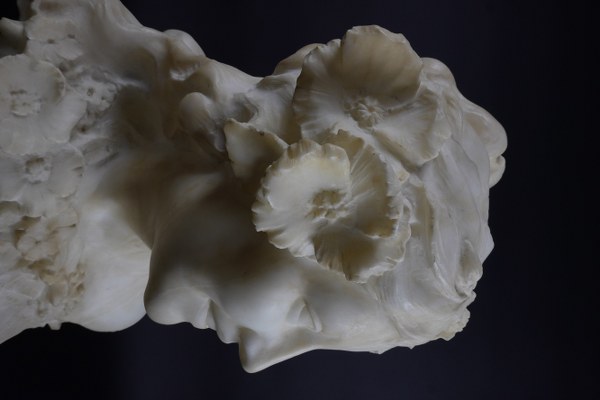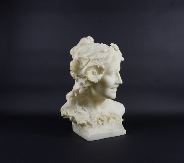 Buste de jeune femme en albâtre, la tête légèrement tournée avec des fleurs dans les cheveux et sous le cou. Intitulée Primavera à la base. Dans l'esprit de Jean-Baptiste Carpeaux. Époque fin du XIXème siècle. Hauteur : 43 cm. Largeur : 33 cm. Profondeur : 24 cm. Petits accidents, léger fêle sur l'épaule gauche.
