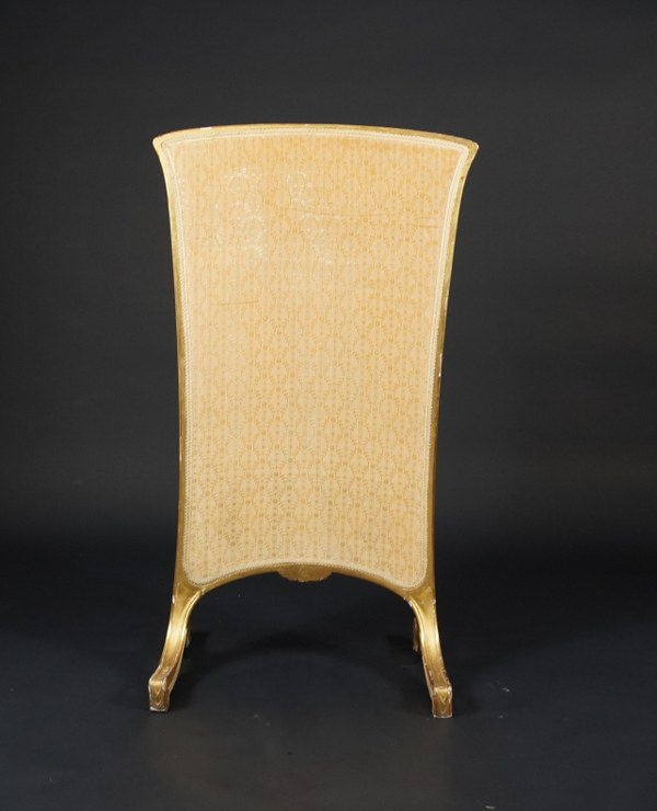 Écran de feu en bois doré mouluré et sculpté de fleurs à trois compartiments. Il repose sur un piétement à deux patins nervurés. Le dos a un seul panneau. Époque 1900. Porte la mention 'La Ruche' au revers. Hauteur : 107,5 cm. Largeur : 61 cm. Profondeur : 43 cm. Tissu usé et accidents à la dorure.