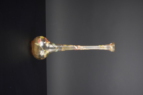 Émile GALLÉ (1846-1904). "Chèvrefeuilles " circa 1900. Grand vase soliflore parlant "Lien d'Amour" en verre ambré à partie base bulbée reposant sur un talon, long col droit s'évasant dans le haut. Il est décoré en relief d'émaux polychromes et partiellement dorés sur fond givré à l'acide. Signature dorée japonisante sur le bulbe. Référence B-102 gravée à la pointe sous la base. Hauteur : 32 cm.