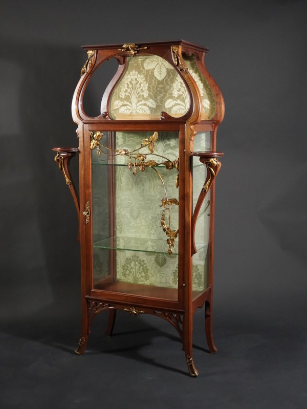 Vitrine d'exposition en acajou mouluré et sculpté présentant une niche en partie haute, ouvrant en façade par une porte vitrée flanquée de deux tablettes latérales. Elle est ornementée d'un décor de bronzes dorés à motifs floraux. Fond tapissé d'une soierie verte. Époque 1900. Travail attribué à Georges GUERIN. Hauteur : 169 cm. Largeur : 97 cm. Profondeur : 42 cm. Accidents, soulèvements du placage, manques. Soierie de la niche usée. Une des deux étagères fêlée.