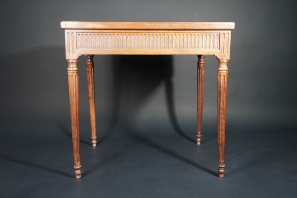 Table tric-trac en acajou plaqué sur le dessus d'un jeu de dame avec des réserves sur les côtés, encadrées de filets d'ébène et buis, l'envers garni d'un feutre. Les traverses du piètement sont décorées de cannelures avec deux petits tiroirs en côté. L'intérieur est plaqué d'un jeu de tric-trac. Il repose sur quatre pieds fuselés à cannelures. Époque Louis XVI. Travail de la région Bordelaise. Hauteur: 71 cm. Largeur: 74 cm. Profondeur: 55 cm. Réparations, accidents, soulèvement.