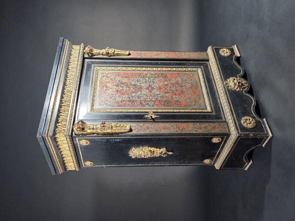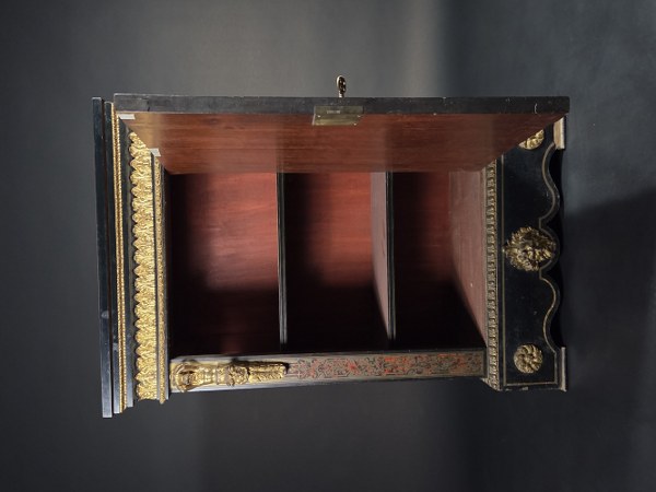 Meuble d'appui en bois noirci et marqueterie d'écaille et laiton ouvrant à une porte. Riche garniture de bronzes dorés : palmettes, moulures, termes, rosaces, masques et lingotière. Dessus de bois noirci. Époque Napoléon III. Hauteur : 109 cm. Largeur : 71,5 cm. Profondeur : 37,5 cm. Manques et accidents.