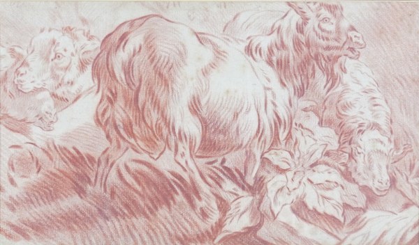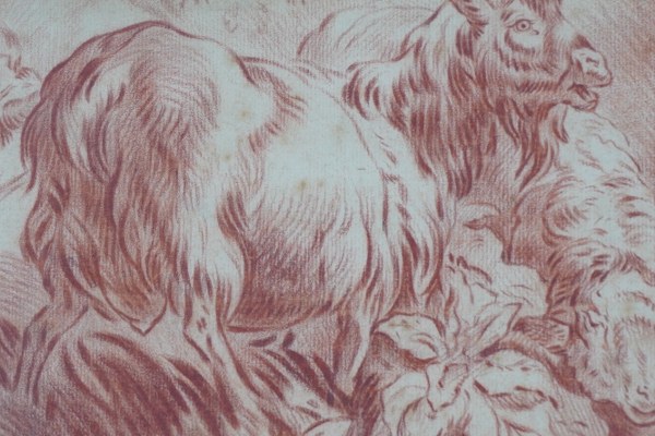 D'après Jean-Baptiste HUET. Chèvres et moutons. Sanguine. Vue : 15,5 x 26,5 cm.
