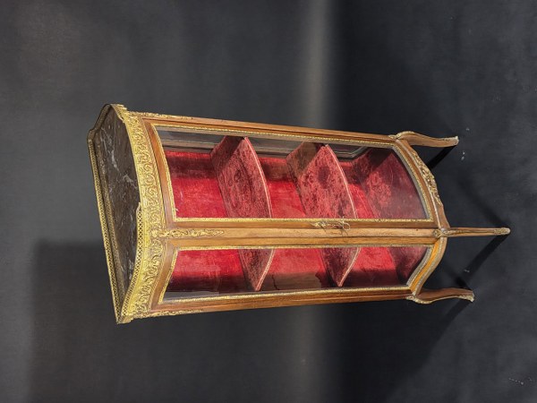 Petite vitrine bombée en façade et vitrée sur les côtés en placage d'acajou ouvrant par une porte. Fond, étagères et bas garnis de velours. Elle repose sur quatre pieds galbés. Dessus de marbre rouge. Habillage de cuivre doré. Époque 1900. Hauteur : 139,5 cm. Largeur : 67 cm. Profondeur : 33 cm. Fentes, usures.