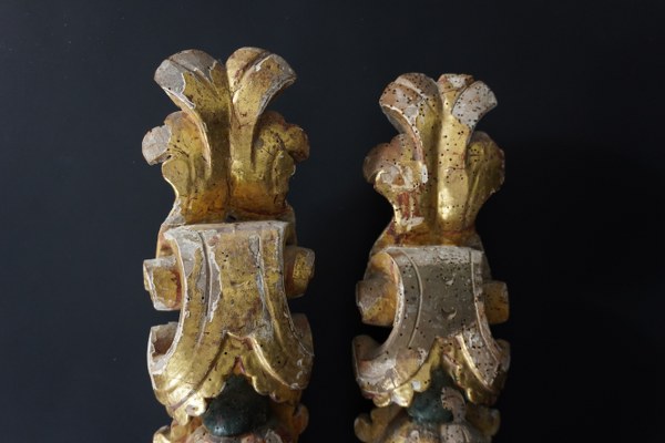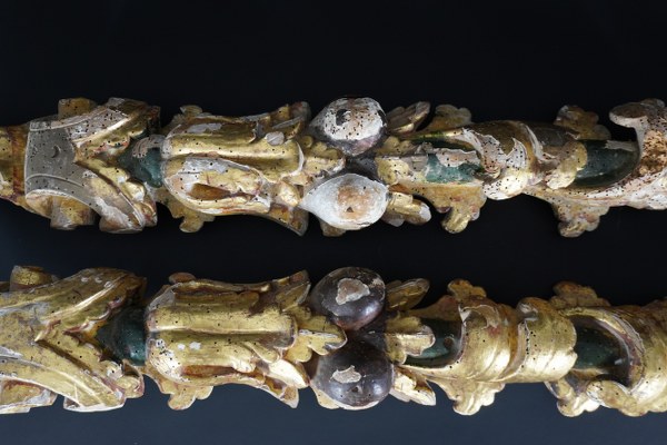 Paire d'éléments en bois sculpté et peint de palmettes et fruits. Époque début XVIIIème siècle. Hauteur : 107 cm. Largeur : 11 cm. Manques et accidents, trous de vers.