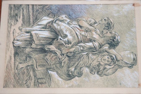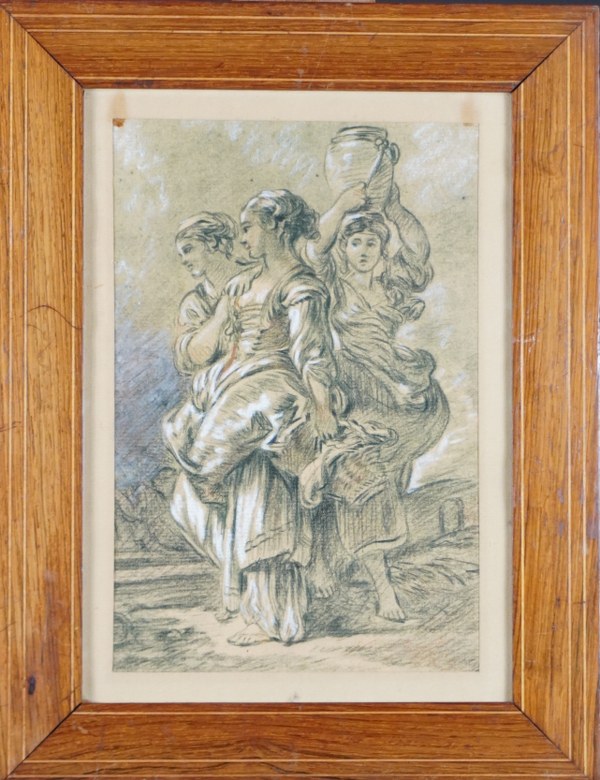 D'après François BOUCHER (1703-1770). Le retour du marché. Impression rehaussée encadrée sous verre. A vue : 24,5 x 16 cm.