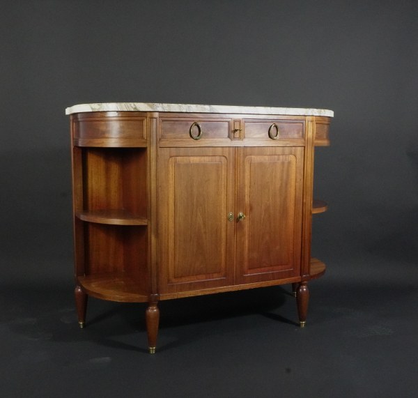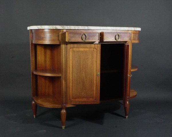 Desserte en acajou à dessus de marbre blanc veiné gris. Ouvrant par deux tiroirs en ceinture et deux vantaux en façade. Style Louis XVI. Dimensions avec marbre : 103 x 129,5 x 46,5 cm. Petits accidents, traces d'humidité.