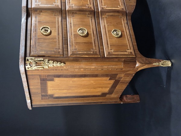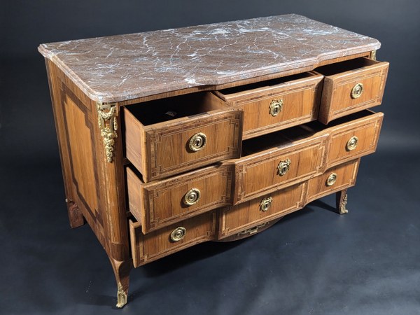 Commode à ressaut ouvrant par cinq tiroirs sur trois rangs en placage de bois de rose dans des encadrements d'amarante, de violette et filets clairs. Les montants sont arrondis et se terminent par des pieds galbés. Les côtés, plaqués de bois de rose sont à encadrement d'amarante et violette. Les montants arrières sont à ressaut. Garniture de bronzes dorés : entrées, poignées rondes, chutes, sabots et tablier. Dessus de marbre rouge royal à gorge, restauré. Estampillée J. PORQUET, maître en 1767. Époque Louis XVI. Hauteur : 86 cm. Largeur : 128 cm. Profondeur : 61 cm. Quelques manques. Porquet Jacques, maître à l’âge de 63 ans par l'édit royal de 1767. Il figurait parmi les créanciers de Jean François Oeben auquel il avait sans doute fourni quelques travaux.