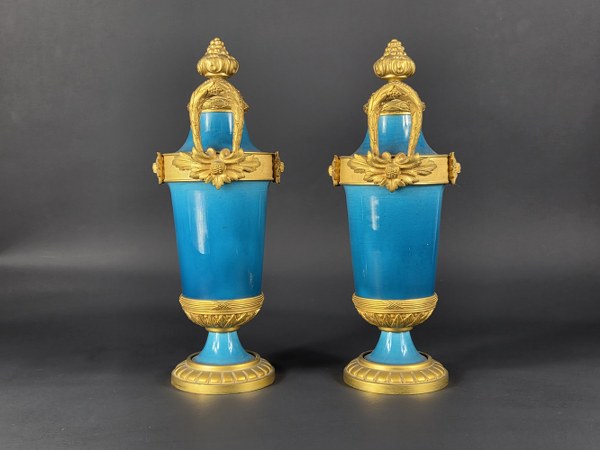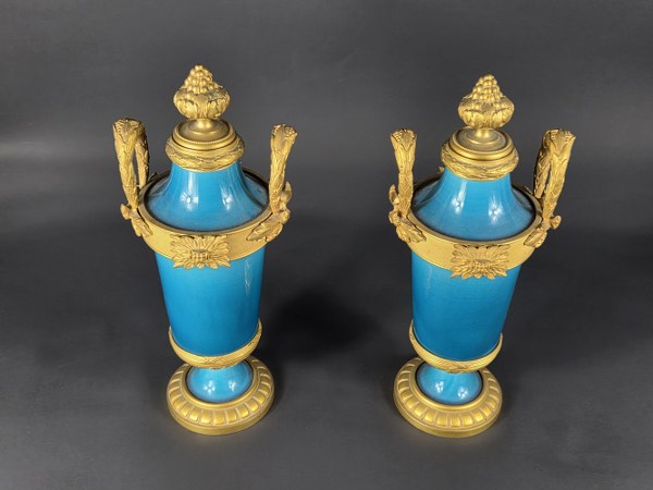 Paire de vases en porcelaine bleue à monture en bronze doré. Base, support du corps central, haut à anses et fleurs et chapeau en bronze. Époque fin XIXème siècle. Hauteur : 35 cm. Largeur : 14 cm.